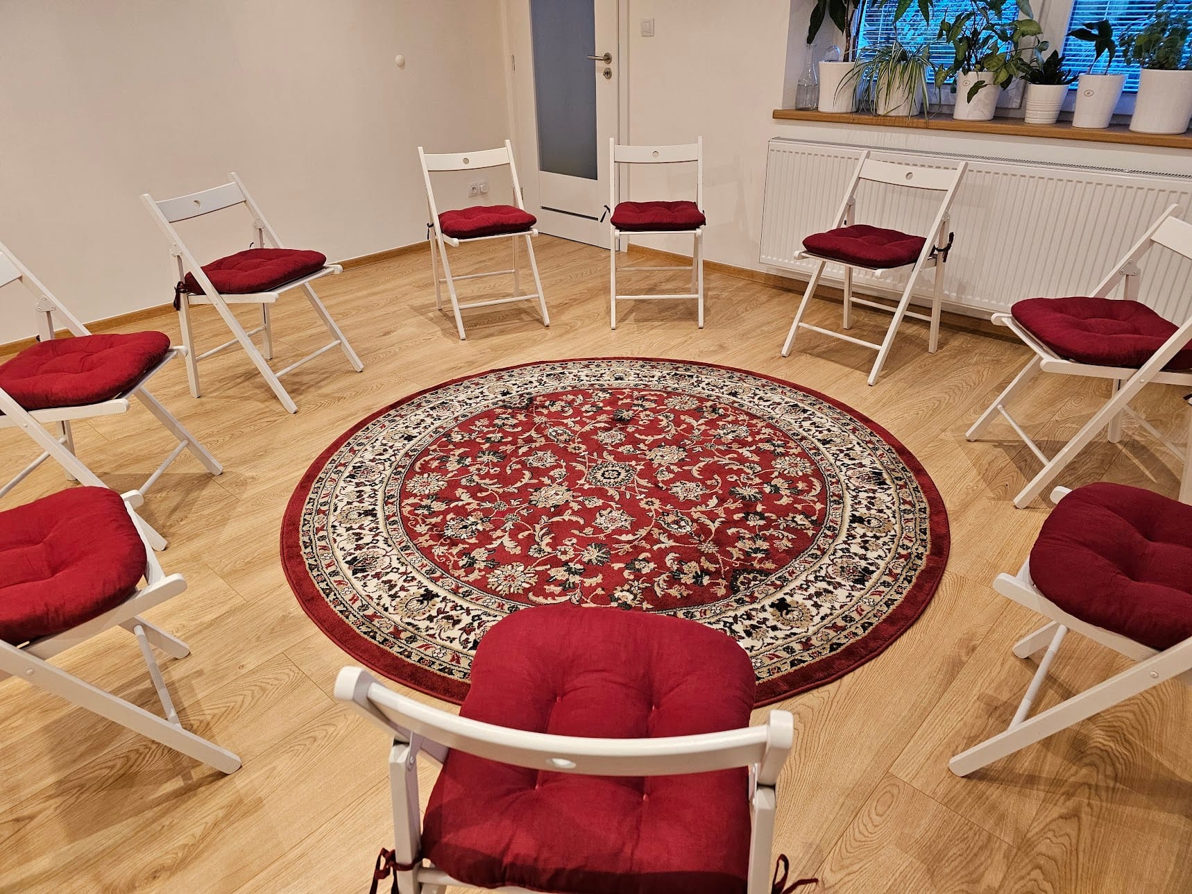 Uspořádání židlí a stolů je variabilní. Místnost se dá přizpůsobit pro kurz, školení, konstelace, firemní poradu, koučování nebo konzultaci.