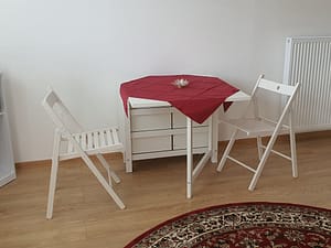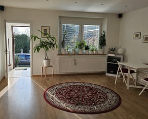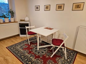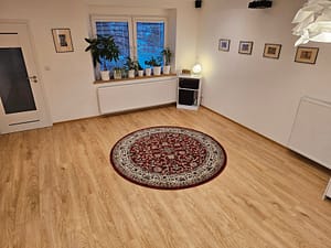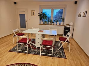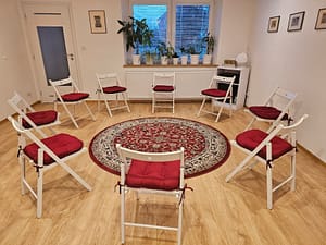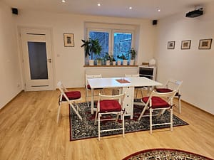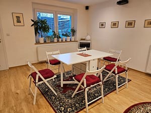 Uspořádání židlí a stolů je variabilní. Místnost se dá přizpůsobit pro kurz, školení, konstelace, firemní poradu, koučování nebo konzultaci.